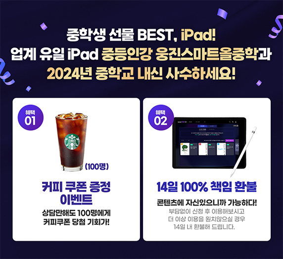 중등인터넷강의 웅진 스마트올중학 아이패드 패키지와 함께 2024년 중등 내신 대비 사수 입시 준비까지 한 번에 14일 100% 책임 환불 웅진 스마트올중학 가격 부담 없이 체험 후 결정하셔도 늦지 않겠어요 ~♡